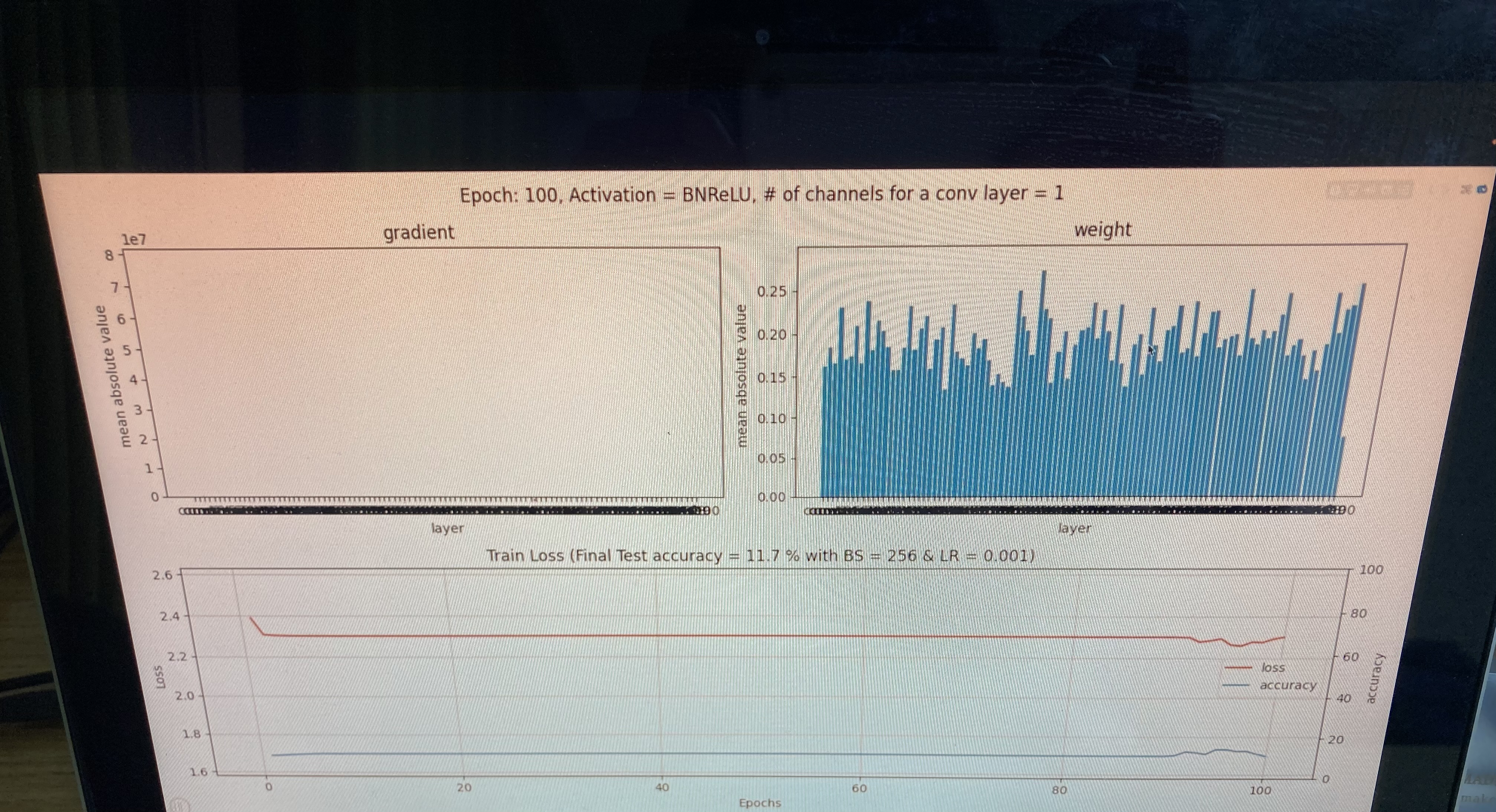 BN + ReLU를 사용하였음에도 불구하고 overfitting이 일어납니다. 그래서 증상이 어떻게 뜨는지 확인을 해보겠습니다. 일단 10-layer model은 별 문제가 없습니다. 100 epochs를 training 한 결과 Accuracy는 95.2%고 training loss도 건강해 보입니다. 하지만 100-layer model은 전에 BN이나 ReLU를 사용하기 전인 거의 random수준인 performance를 보여줍니다. Accuracy는 11.8% 밖에 안되고 training loss는 거의 변동이 없습니다.