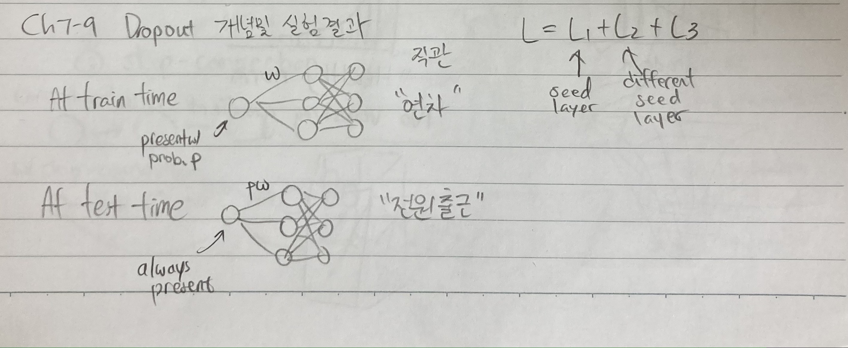 Dropout은 어떻게 보면 모델 경량화랑 느낌이 비슷하지만 조금 다르다. Hyperparameter, p는 어느 한 노드를 살리거나 없엘 확률이다. 노드가 여러 개 있을 때 사실 하나하나의 노드들이 도대체 무엇을 잘하고 있는지 확신하긴 쉽지 않다. 그래서 차라리 모든 노드들이 역할을 맡게 하는 것이 dropout이다. 노드를 랜덤으로 몇 개 없애버린다고 하자. 어느 날 회사에 출근을 했는데 사무실에 반이 연가를 썼다. 그러면 남아 있는 직원들은 원치 않게 할 일이 많아지고 중요한 건 다른 직원들을 일들을 떠맡게 된다. 이러면 노드마다 실력이 쌓인다. 여러 임무를 할 수 있으니, 한 업무만 담당하는 주임에서 팀장급으로 업그레이드된다. 자세한 내용은 다음장에 설명하겠습니다. Dropconnection은 node대신 connections, 즉 edge를 확률에 따라 없애는 technique이다.